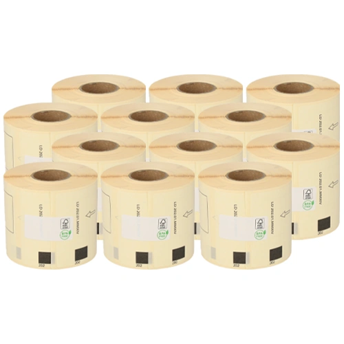 One of our Brother labels is the compatible Brother DK-11202. These die-cut labels are made of white thermal material with a permanent adhesion. Thermal material has to be printed with a thermal printer, the Brother label printer. Thermal labels change colour when exposed to heat. No ink or toner is needed for the printing process. The Brother rolls are delivered without a holder. With every 12 rolls, you receive a free transparent plate that fits your Brother rolls. This plate is reusable and universal which means that you only need one holder for your printer. You need to order the holder once. The compatible Brother DK-11202 die cut rolls are often used as address labels or folder labels.